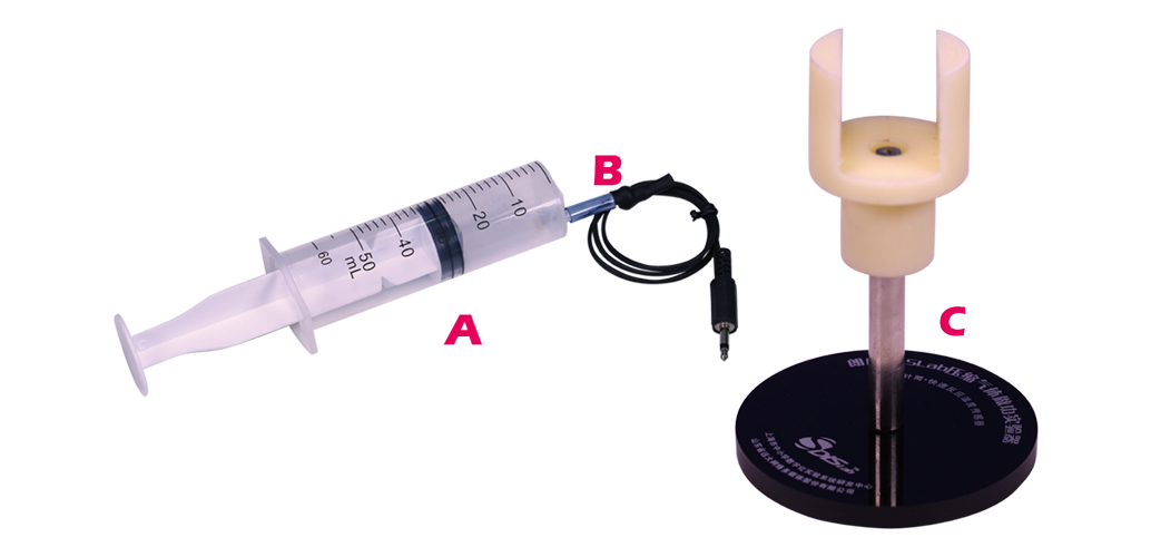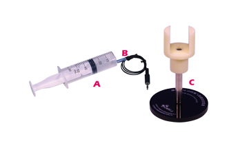 Components: A. Large Size Syringe, B. Connector port, C. Base.