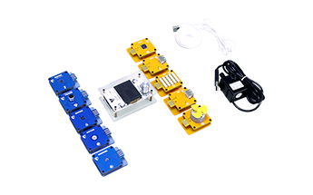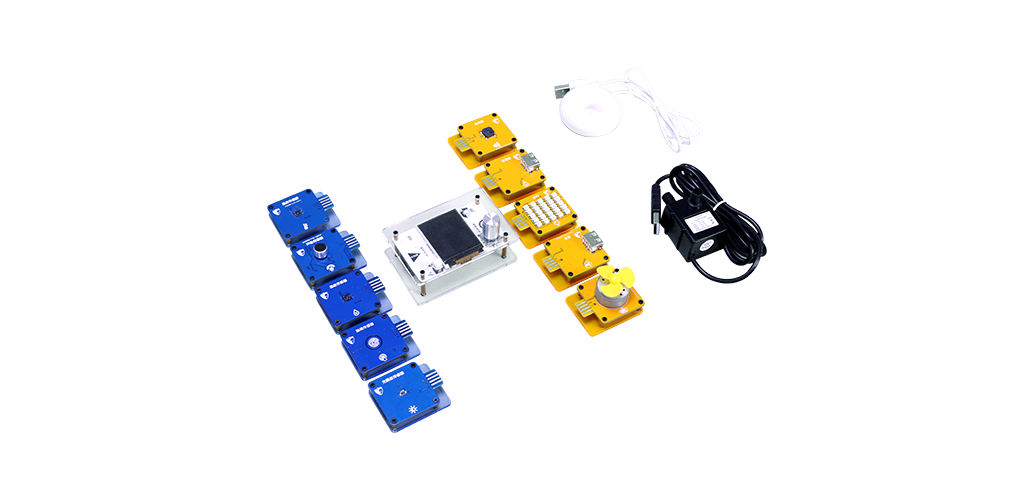 白色的控制模塊、藍色的傳感器模塊(含溫度傳感器、濕度傳感器、光照度傳感器、聲級傳感器、觸摸傳感器)、黃色的執行器模塊(含彩燈、蜂鳴器、風扇、加濕器、水泵)及附件(含加濕器、直流水泵、充電(diàn)線(xiàn)、充電(diàn)器)構成。
